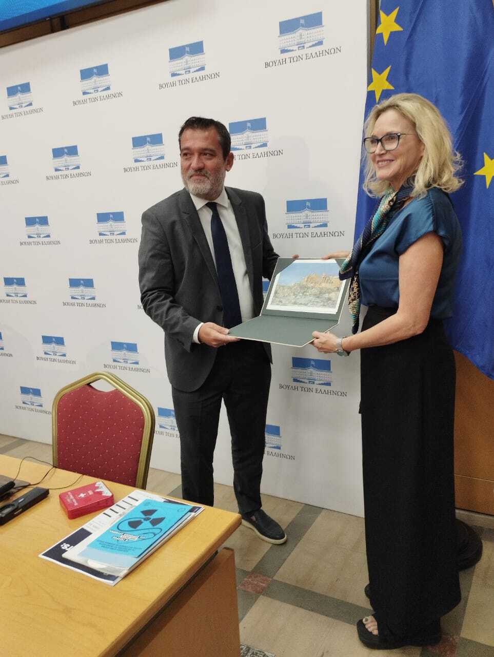 ICAN Executive Director Melissa Parke meeting Mr Livanos, MP of Nea Dimokratia party, representative of the Presidency of the Parliament.
